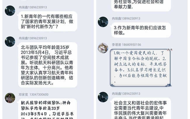 接着,覃老师根据同学们的发言发表讲话。她希望同学们把理想信念、家国情怀、责任担当植入自己的心田,做一个有理想、有本领、有作为的社会主义建设者和接班人。此外,王老师还对同学们提出期望:希望同学们作为青年大学生,应该树立远大目标,认真学习增长见识,不断超越自己,在未来为祖国发展奉献力量。