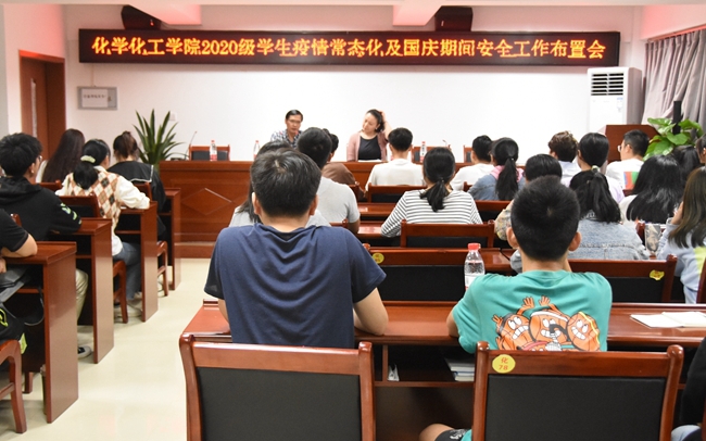 为加强学生安全教育,落实国庆期间疫情防控工作,9月24日下午19时,化学化工学院于至安楼(北)602会议室开展了2020级学生疫情常态化及国庆期间安全工作布置会。化学化工学院党总支书记庞向东、2020级政治辅导员赵艳杰、团委学生组织部分成员以及2020级各班班委参与此次会议。
