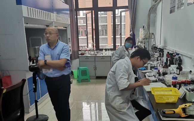 为确保十一“国庆期间”实验室安全平稳运行,化学化工学院副院长石文兵、实验员孙晓瑞在2020年9月29日下午对化学化工学院教学和科研实验室的安全工作进行专项检查,检查了至安北楼三楼无机重点实验室、北四楼化工教学实验室、北五楼学生基础化学实验室和南五楼有机科研实验室。检查方式以现场查看和询问为主,对实验室仪器设备、危化品、防火防盗以及安全设施等方面进行了全面检查。