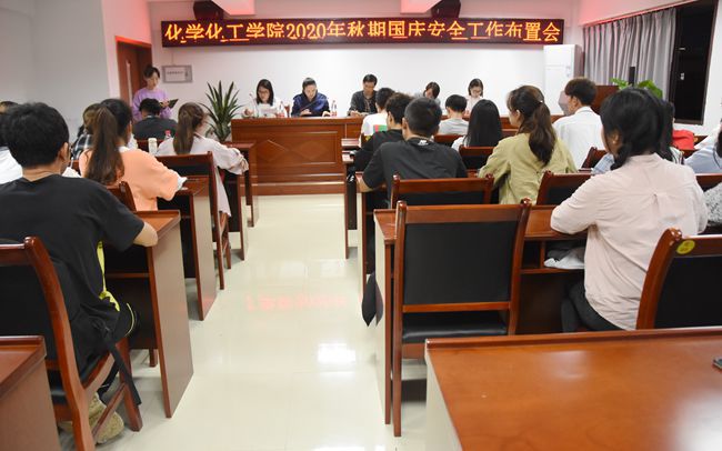 “国庆、中秋”长假即将到来,学生的放假安全问题是学院工作中的重中之重。为加强国庆安全教育,确保我院学放假期间的人身安全,严防安全事故的发生,9月28日晚19时,化学化工学院于至安楼(北)602会议室开展2020年秋期国庆安全工作布置会。化学化工学院党总支书记庞向东、团委书记赵艳杰、2017级政治辅导员张丽、2018级政治辅导员王咏梅、2019级政治辅导员覃小艳以及2018、2019、2020级班长、团支部书记参与此次会议。