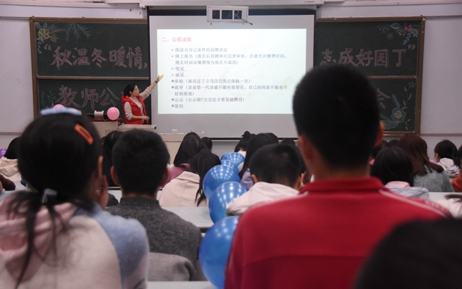 在此次教师公招培训会中,张婷老师从公招考试招聘信息查询、笔试、面试三个方面进行了详细的讲解。首先,张老师强调,重庆人力资源和社会保障网、重庆事业单位招聘考试、重庆教师招聘以及特岗招聘等渠道都可对公招信息进行查询。接着,她向同学们详细讲解了笔试的主要考查内容。张婷老师强调,同学们应着重复习巩固《学科专业知识》,一个课时对应一个教案与说课稿,及时完成单元测试题,以框架的形式来记忆公共科目。此外,张婷老师谈到,面试组织形式主要分为“结构化、说课、试讲”三种,并强调,在面试时,师范生需构建教学流程,保证教学内容的完整,突出教学片段的重点,严格把控教学时间。最后,张婷老师提出教师公招与点招的区别,加强了师范生对教师公招的理解。