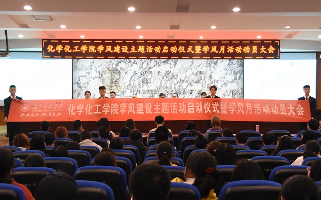 为深入贯彻落实全国教育大会精神,创建优良学风,落实立德树人根本任务,11月9日晚19时,化学化工学院于鉴湖学术报告厅开展学风建设主题启动仪式暨学风月活动动员大会。化学化工学院党总支书记庞向东、教学副院长石文兵、团委书记赵艳杰、化学系党支部书记谭晓平、基础化学系主任张福兰、党总支专职组织员李月涵、各年级政治辅导员、部分班导师以及2018级、2019级、2020级部分学生参与此次动员大会。