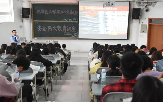 为进一步加强我院学子的消防安全意识,为他们普及消防安全知识,帮助他们掌握在突发状况下的灭火、逃生技能,11月6日下午14时30分,化学化工学院于格理楼04阶梯教室举办2020年秋期安全防火教育讲座。此次讲座由贾乾发博士主持,重庆市利民防火中心刘星吕教官主讲,2018级化学工程与工艺1班、2班,2019级化学(师范)1班、2班,2020级化学(师范)2班参加。