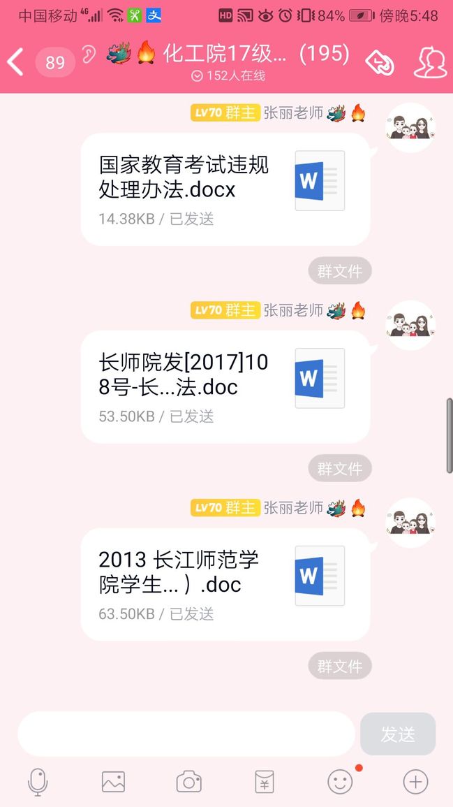 在教育中,张丽老师在2017级年级群中下发了“国家教育考试违规处理办法”等研究生考试相关违规违纪文件,并收取了学生学习文件的截图,监督我院考研学生认真研读文件,形成遵守考试纪律的自觉意识。此外,张丽老师还组织各班级在各班事物传达群中开展研究生考试违规违纪主题教育,打造严格按照学校相关规定执行的教育体制。最后,张丽老师还带领全年级127名考研学生进行“我已认真学习学校和学院下发的关于考试违纪违规处理的三个文件,并保证认真对待2020年12月26-28号的研究生考试……”宣誓,要求他们端正思想,公正考试。相信我院2021届考研学生定能自觉遵守考试纪律规定,秉承“学高身正,敬业自强”的校训顺利完成考试。