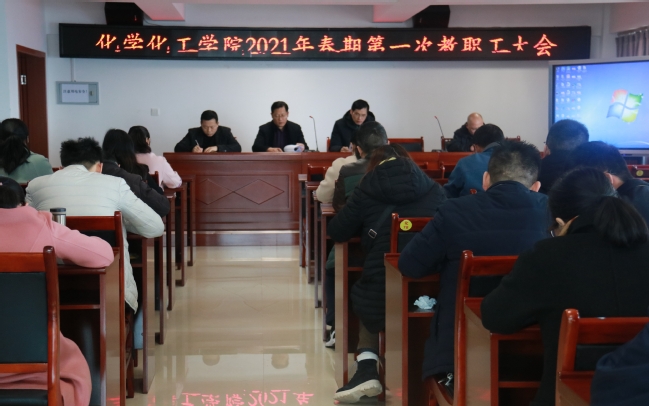 为明确我院教职工的工作职责,准确部署新学期工作计划,协调安排各项工作,3月5日下午14时30分,化学化工学院于至安楼(北)602会议开展2021年春期第一次教职工大会。化学化工学院院长徐建华、党总支书记庞向东、教学副院长石文兵、科研副院长黄辉胜以及全体教职工参与会议。