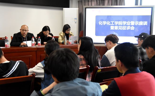 为提高我院学生对学业的重视程度,营造良好的学习氛围,4月9日下午14时20分,化学化工学院于至安(北)楼602开展学业警示座谈会暨意见征求会。化学化工学院院长徐建华、教学副院长石文兵、2020级政治辅导员赵艳杰、2019级政治辅导员覃小艳、2018级政治辅导员王咏梅、化学系主任何树华、教学秘书郭静、绩点未达到2.4的学生及部分班级的班长和学习委员参加本次会议。