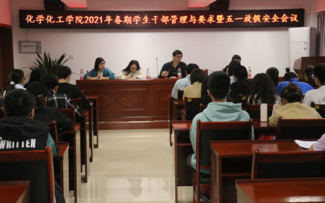 为推动学生骨干管理工作,增强他们的责任意识,同时帮助我院各班班长、团支书明确五一假期安全工作的重要性,提前做好五一假期间的安全工作布置,4月26日晚19时,化学化工学院于至安楼(北)602会议室开展2021年春期学生骨干管理与要求暨五一放假安全会议。化学化工学院党总支书记庞向东、团委书记兼2020级政治辅导员赵艳杰、2019级政治辅导员覃小艳、2018级政治辅导员王咏梅、2017级政治辅导员黎兰、2018级、2019级、2020级各班班长、团支书和部分学生骨干参与此次会议。