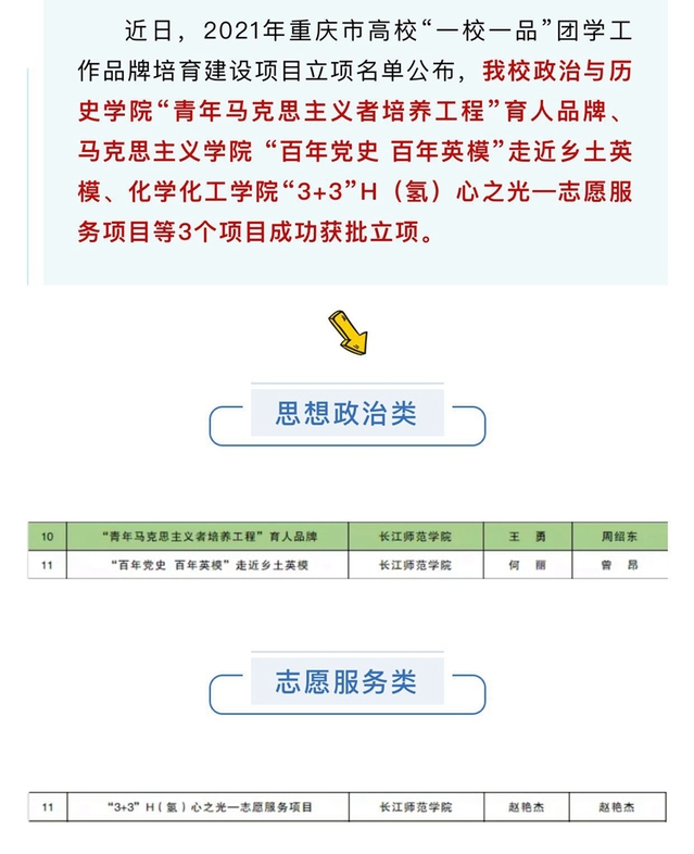近日,长江师范学院化学化工学院“3+3”H(氢)心之光—志愿服务项目成功入选2021年重庆市高校“一校一品”团学工作品牌培育建设项目。