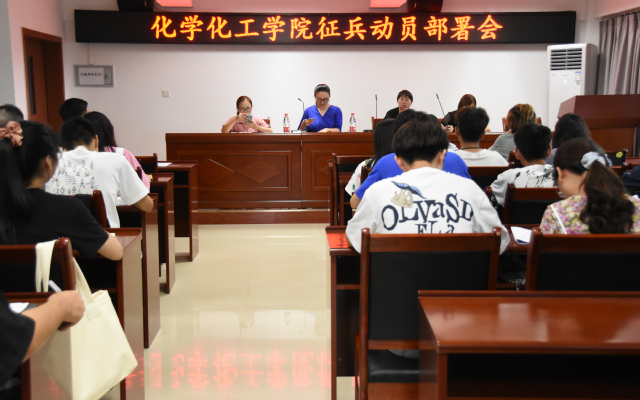 为响应国务院、中央军委征兵动员令,同时让我院学子全面了解征兵的相关政策,6月24日晚19时,化学化工学院于至安楼(北)602会议室召开了征兵动员部署会。此次会议由2018级政治辅导员王咏梅主讲,团委书记兼2020级政治辅导员赵艳杰、2019级政治辅导员覃小艳、2017级政治辅导员黎兰以及化学化工学院部分学生参加。