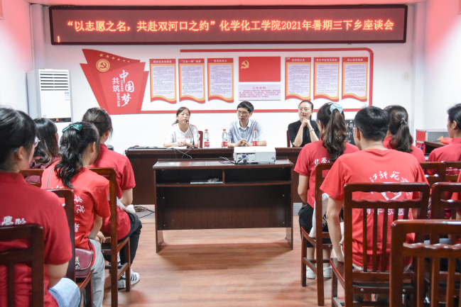 7月10日上午8时,长江师范学院化学化工学院开展了以“以志愿之名,共赴双河口之约”为主题的2021年暑期“三下乡”座谈会。重庆市涪陵区马鞍街道双河口社区党委书记秦婷,长江师范学院化学化工学院党总支书记庞向东、团委书记赵艳杰和全体志愿者参与会议。
