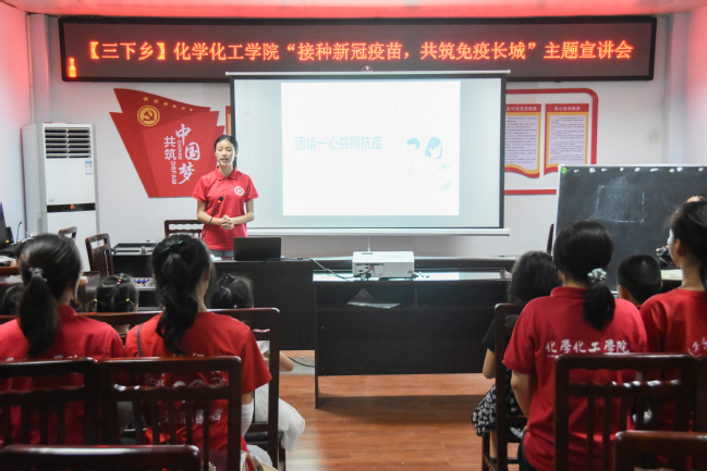 为帮助双河口社区居民正确认识疫苗接种在疫情防控中的重要作用,了解国家对于新冠疫苗的扶持政策,进一步提升他们爱党、爱国的意识,长江师范学院化学化工学院2021年暑期“三下乡”党史学习实践团于涪陵区双河口社区开展“接种新冠疫苗,共筑免疫长城”主题宣讲会。双河口社区部分居民参加此次宣讲会。