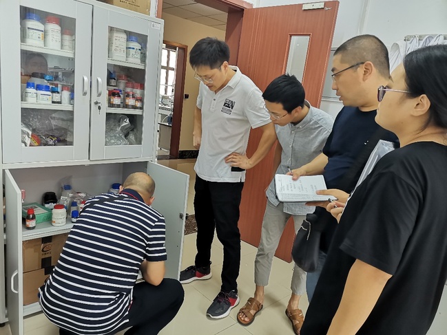 为确保暑假假期实验室安全平稳运行,化学化工学院领导在2021年7月15日14:30分组织了化学化工学院教学和科研实验室的安全专项检查。化学化工学院石文兵副院长、黄辉胜副院长、时建伟主任、孙晓瑞老师等参加。