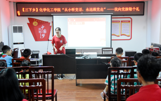 为庆祝中国共产党成立100周年,引导青少年从小听党话、感党恩、跟党走,7月15日上午10时30分,化学化工学院暑期“三下乡”党史学习实践团于涪陵区双河口社区开展“从小听党话,永远跟党走——我向党旗敬个礼”主题教育活动。