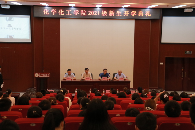 金秋九月归,开学读书勤。9月14日上午8时,化学化工学院于鉴湖学术报告厅举办2021级新生开学典礼。化学化工学院院长徐建华、党委书记庞向东、科研副院长黄辉胜、团委书记赵艳杰、党委专职组织员李月涵、 2019级政治辅导员覃小艳、2020级政治辅导员邓中燕、2021级政治辅导员黎兰、化学系党支部书记谭晓平、化学系主任何树华、化学工程与工艺系主任高枫、各教学和团学老师以及2021级全体新生参与开学典礼。