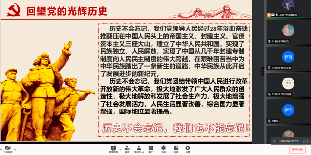为了帮助我院学子树立正确的国家观、历史观与民族观,厚植他们的爱党、爱国情怀,11月9日晚7点,化学化工学院于腾讯会议开展了以“恰是百年芳华—我是接班人”为主题的第十六期大骨干培训讲座,此次讲座由化学化工学院团委书记赵艳杰主讲,2019级、2020级、2021级部分学学生参加。