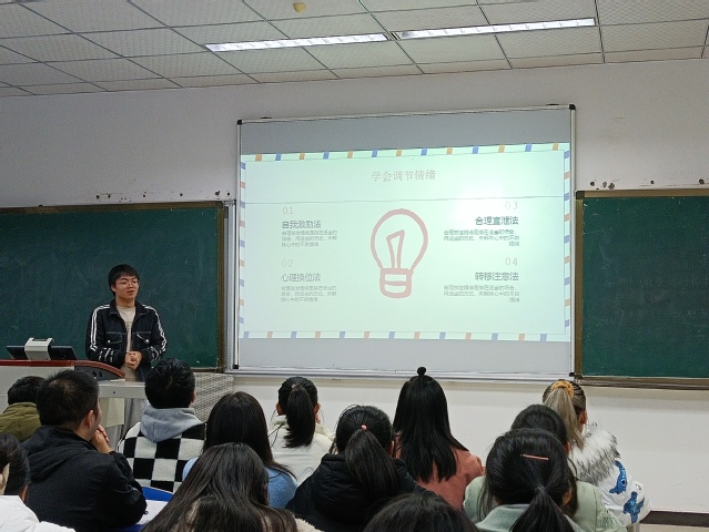 此次活动由各班心理委员主讲,围绕“认识情绪”和“调节情绪”两个方面展开。活动伊始,心理委员对消极情绪和积极情绪做了详细的讲解。他们指出,认识情绪是必要的,情绪可以使人精神焕发,也可以使人萎靡不振。随后,各班心理委员提出了三点调节情绪的有效方法:一是自我激励法,通过正面积极的语言让大脑中的潜意识向成功靠近;二是心理换位法,设身处地,从别人所处的位置和角色去思考;三是合理发泄情绪法,在适当的场合,用适当的方式来解除心中的不良情绪。最后,有同学分享了对“正确认识情绪”的感悟。他讲到,喜怒哀乐是生活的常态,正确处理不良的情绪是心理健康发展的关键。