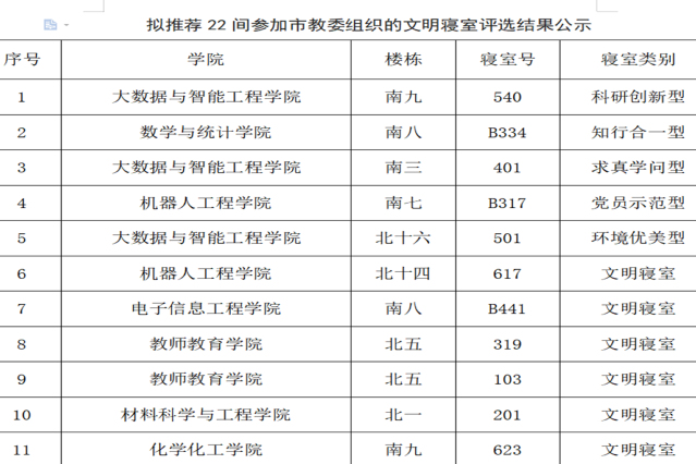 活动初期,各班班导师通过班团会时间积极宣传本次评选工作的评选要求、方式、规则等具体情况,确保本次评选活动得以人人知晓,以增加活动的参与度。在评选环节中,我院领导、老师秉承着公平、公正、公开的原则进行初评,再上报至学校进一步进行评选。最后,经过学院、学校领导、老师、宿舍阿姨的实地走访,共计评选出校级“科研创新型”宿舍两间、“党员示范型”宿舍一间、“环境优美型”宿舍一间、“行合一型”宿舍一间、“求真学问型”宿舍一间。其中,南苑九舍623舍推至重庆市参与市教委文明寝室的评选。