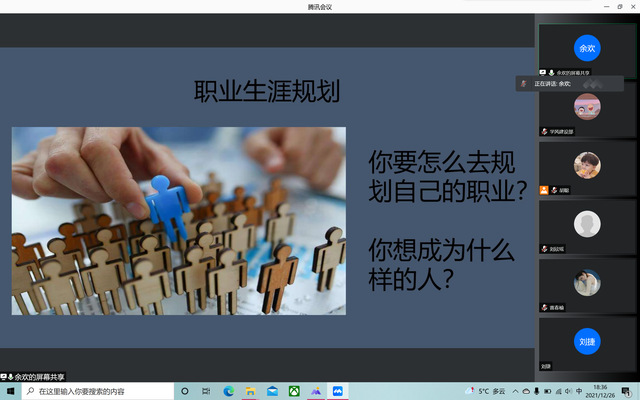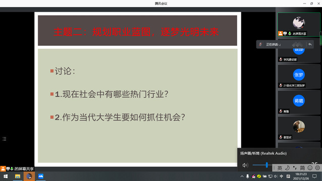 为帮助我院学子正确地认识自己,合理规划自己的目标,12月26日下午6时,化学化工学院于腾讯会议开展了“规划职业蓝图,逐梦光明未来”主题班会。化学化工学院2021级全体学生参与。