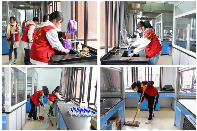 活动伊始,青年志愿者服务团团长陈虹君宣讲了相关安全事宜,并进行了工作分配。随后,志愿者结合实验室实际情况,有条不紊地对实验器具、桌面柜台、玻璃门窗以及各个卫生死角进行仔细地清理打扫,保证不留卫生盲区。此外,志愿者还对相关消防设备以及实验室电路进行检查,力争排除安全隐患。