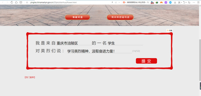 此次活动分为网上祭奠与抒写感言两个部分。活动伊始,同学们怀揣着虔诚的心,前往“中华英烈网”参加 “2022·奋进·网上祭英烈”云祭扫主题活动。通过此次线上活动,同学们了解先烈的英勇事迹,主动为先烈献花、祭酒或通过发布网络留言等方式怀念逝者、寄托哀思。随后,同学们纷纷写下自己对于此次云祭扫主题活动的感受。他们不仅表达了对先烈的悼念、敬畏与尊重,也表达了要学习英雄烈士无畏牺牲、无私奉献的精神,为实现中华民族的伟大复兴而努力奋斗的决心。其中,有同学写到,雕刻在石头上的记录,可能会随时间的流逝而渐渐消失,但镌刻在人们头脑中的记忆,却会永远清晰。不忘烈士抛忠骨,民族复兴中华魂。我院学子应当秉承遗志,奋斗不息,让青春闪耀。