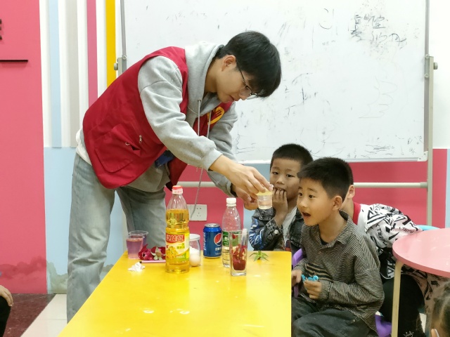 活动伊始,志愿者们对小朋友们进行了一对一辅导,在解答他们学习上的疑惑的同时,也帮助他们解决生活中遇到的难题。随后,志愿者们为小朋友们带来“六一小知识”科普课堂,在课堂中,他们带领小朋友们认识儿童节、了解各个地方儿童节的习俗,他们还为小朋友们分享有趣的诗词、字谜,现场气氛活跃,一片欢乐。最后,志愿者们带领小朋友们做了“不倒的鸡蛋”、“变色的玫瑰”等有趣的化学小实验,在引起小朋友们浓厚化学兴趣的同时,也培养了志愿者们的实验能力。