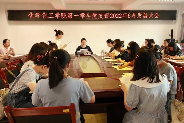 为我院第一学生党支部注入新鲜血液,壮大党员队伍,2022年6月1日中午12时30分,化学化工学院第一学生党支部在至安楼(北)607会议室召开6月党员发展大会,讨论接收岑敏等八名发展对象为预备党员。本次会议由化学化工学院第一学生党支部书记赵艳杰主持,支部全体党员参加。