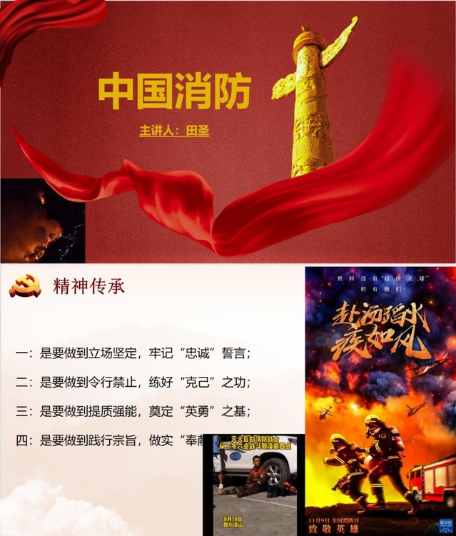 会议伊始,支部成员田圣同志为我们分享了中国消防的故事,生活中总有一些平凡的英雄,坚守自己的岗位。而消防员是就一个为消灭火灾及救护服务,同时也参与其他救援的人群。常常不顾自身的安危救人,他们都具有四点消防精神:一是要做到立场坚定,牢记“忠诚”誓言;二是要做到令行禁止,练好“克己”之功;三是要做到提质强能,奠定“英勇”之基;四是要做到践行宗旨,做实“奉献”之举。作为新时代青年的我们,要做到知足感恩,以绝对的忠诚听党话、跟党走,始终保持坚定的政治立场,还要严守党规党纪、严守道德底线,知敬畏、存戒惧,管住自己的情绪,做到个人服从组织,个人利益服从集体利益。同时,要传承好英勇顽强的战斗精神,切实练就过硬的专业本领,担时代使命。
