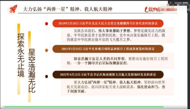 伟大的事业孕育伟大的精神,伟大的精神推动伟大的事业。为引导我院学子深入了解我国航天事业,学习载人航天精神。2022年12月7日19时,化学化工学院于腾讯会议开展“共聚星河之梦,再创航天辉煌”主题党课。此次党课由化学化工学院副院长黄辉胜主讲,2022级化学工程与工艺1班全体学生参加。