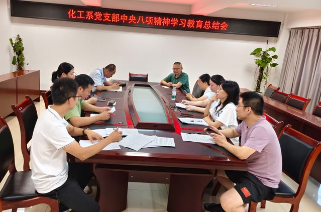 为深入贯彻中央八项规定精神学习教育,持续巩固并拓展学习教育所取得的丰硕成果,以钉钉子精神锲而不舍落实中央八项规定精神,全力推进作风建设常态化长效化。化工系党支部于2025年9月19日10:00在至安楼(北)607开展深入贯彻中央八项规定精神学习教育总结大会。会议由化工系党支部书记贾乾发同志主持,化工系党支部部分成员参会。