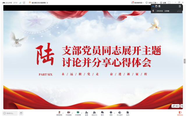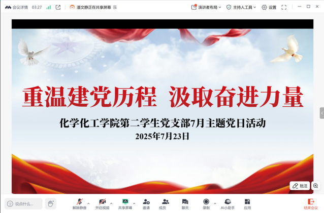 为进一步扎实开展深入贯彻中央八项规定精神学习教育,认真学习贯彻习近平总书记重要讲话精神及相关学习内容,强化党员理想信念,凝聚奋进力量。2025年7月23日晚上19时00分,化学化工学院第二学生党支部于腾讯会议开展了“重温建党历程,汲取奋进力量”主题党日活动。党支部书记覃小艳出席并主持此次会议,第二学生党支部成员全体参会。