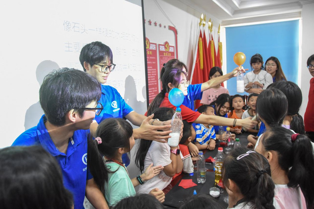 除了“魔法药水”,会“长大”的气球实验也引起小朋友们的欢呼。志愿者将白醋倒入塑料瓶,小苏打装入气球,当二者相遇,气泡“滋滋”冒出,气球慢慢鼓起,直观地展现了酸碱反应原理,让孩子们在趣味中感受化学的魅力。