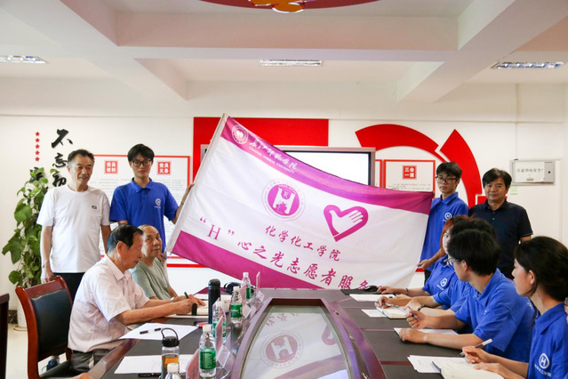 紧接着,徐伯华主任与曹书记为志愿者授旗后,全体志愿者举起右手庄严宣誓,秉承团的优良传统,发扬志愿服务精神,运用化学知识,传播先进文化,为建设和谐社会贡献智慧和力量。