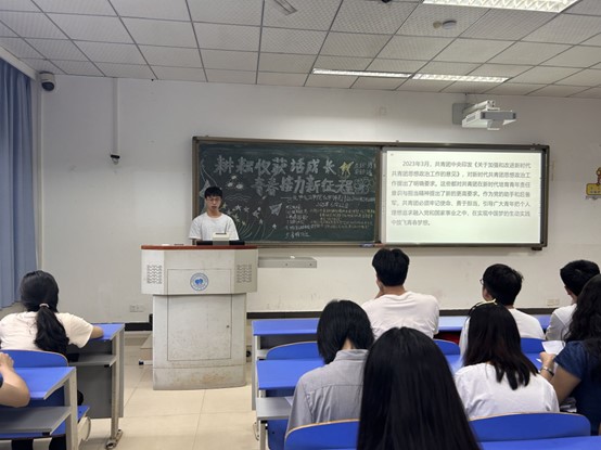 此次团会分为纪检委员点名、齐唱团歌、主题讨论和事务传达这四个环节。在主题讨论环节中,同学们围绕“成长”和“接力”这两个核心词语,展开了热烈的讨论。同学们都积极分享着各自的感想与体会,其中,有同学谈道:“回顾本学期,我最大的成长是在挫折中学会反思和总结,并以乐观的心态坦然面对。作为青年,我们更应该不断成长,接过新时代接力棒,挑起民族复兴重任。”最后,主持人号召同学们以此次团会为契机,以饱满的热情投入学习,以严谨的态度对待学业考核,以坚定的信念迎接新时代的挑战。
