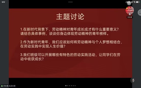 此次班会的核心要义是引领青年学子在劳动中淬炼品格、增长才干。在主题讨论中,同学们围绕“劳动对于青少年的意义”、“如何在劳动实践中实现人生价值”等问题,旨在帮助同学们更加深入地理解劳动的内涵,并引导他们在实践中找到实现自我价值的路径。其中,有同学谈道:“劳动能够锤炼青少年品格、提升实践能力,我们应在实践中践行责任、创造成果,从中收获成长,进而实现人生价值。”最后,主持人鼓励同学们将个人成长融入国家发展大局,以担当精神主动迎接挑战,在辛勤奋斗中实现人生价值,用真才实学和实际行动诠释新时代的使命担当。