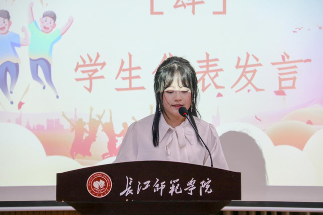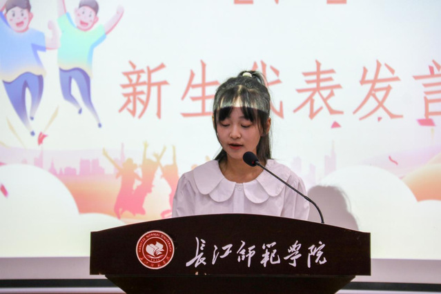 最后,新生代表刘雨涵的发言真挚动人,她深情致谢师长亲友的一路扶持,畅谈对大学生活的无限向往。她表示,将以学习为核心要务,严守校规校纪,积极投身实践,以“千淘万漉虽辛苦,吹尽狂沙始到金”的毅力,勇迎挑战、不负韶华,书写属于自己的青春答卷。