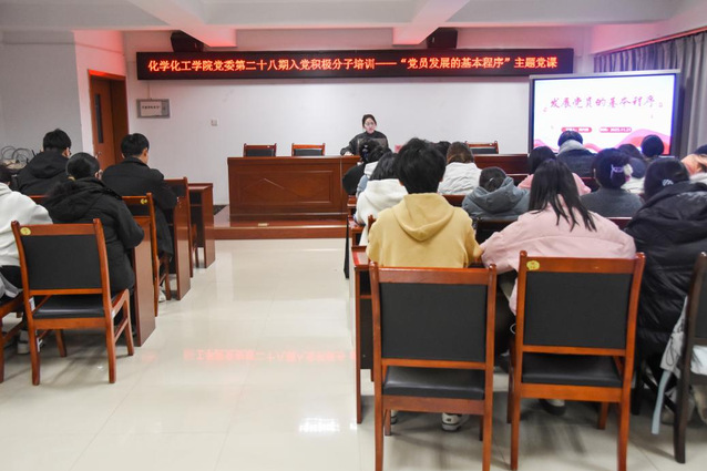 为筑牢党员发展工作根基,严把党员队伍“入口关”,化学化工学院党委于2025年11月21日19时,在至安北楼602开展了第二十八期入党积极分子培训——“发展党员的基本程序”主题党课。本次党课由学院研究生支部书记刘方乘主讲,第二十八期入党积极分子全员参训。