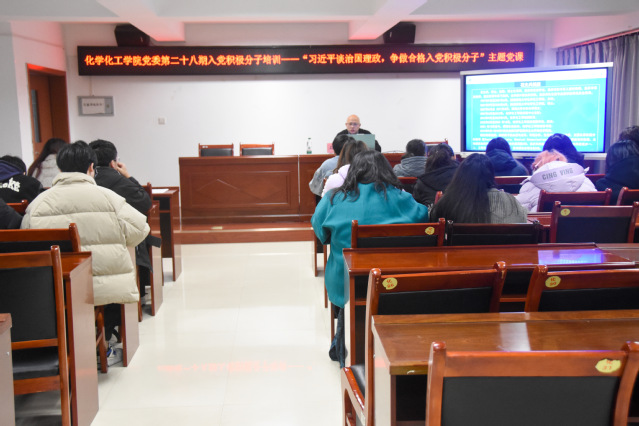 为推动《习近平谈治国理政》学习走深走实,助力入党积极分子以学铸魂、以学增智、以学正风、以学促干,化学化工学院党委于2025年11月24日18点30分,在至安楼北602会议室开展了第二十八期入党积极分子培训——“习近平谈治国理政,争做合格入党积极分子”主题党课。此次党课由化学化工学院党委书记石文兵主讲,第二十八期入党积极分子全员参与。