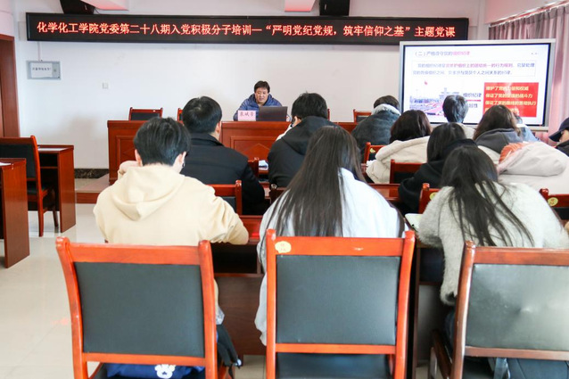 为持续深化党纪学习教育成效,引导入党积极分子筑牢信仰之基、绷紧纪律之弦,2025年11月21日中午13:00,化学化工学院党委在至安北楼602教室组织召开“严明党纪党规,筑牢信仰之基”主题党课。本次党课由学院基础教学党支部书记袁斌芳同志担任主讲,全体培训班学员到场参与。