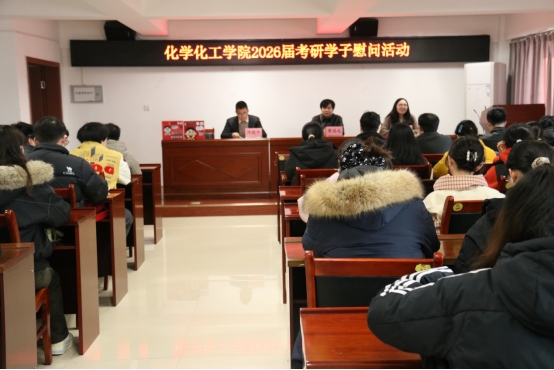 为缓解我院2026届考研学子冲刺阶段的备考压力,传递学院关怀与支持,11月27日8时40分,化学化工学院在至安楼(北)602开展2026届考研学子慰问活动。化学化工学院党委副书记曹团武、副院长谭晓平、2022级辅导员邓中燕、优秀学长陈杰及全体考研学子参与此次活动。