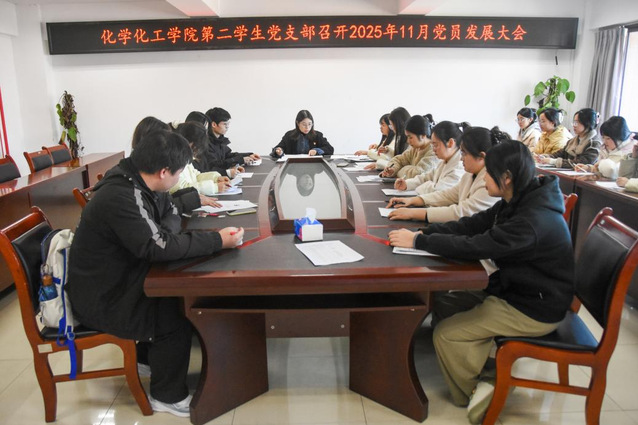 为积极响应党的号召,持续推进党的组织建设,2025年11月21日12时30分,化学化工学院第二学生党支部于至安楼(北)607会议室召开11月党员发展大会,讨论接收李红标、邹盈盈、黄艳虹、向薇、谭永松五位同志为中共预备党员。此次会议由化学化工学院第二学生党支部书记覃小艳同志主持,第二学生党支部全体党员参会。