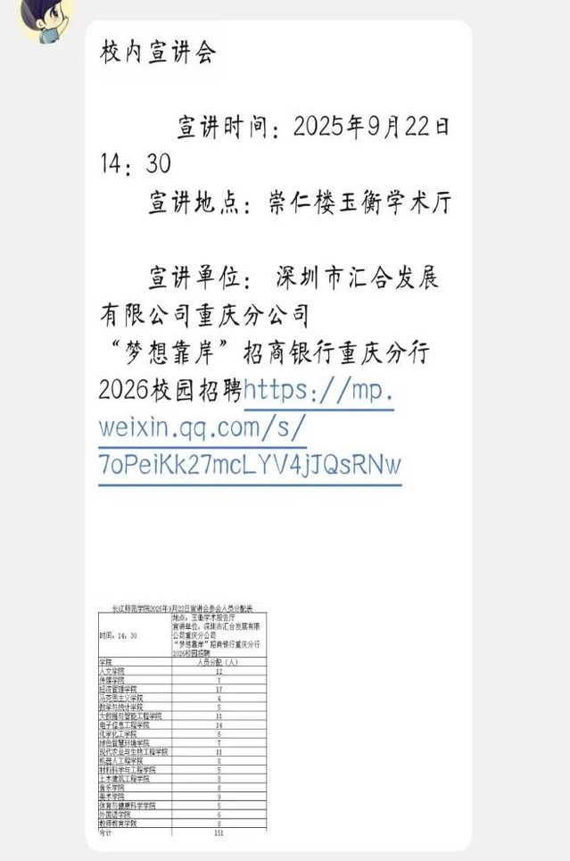 为拓宽学生就业渠道、搭建校企交流平台,助力2026届毕业生高质量就业,2025年9月22日下午14时30分,长江师范学院化学化工学院于崇仁楼玉衡学术厅组织开展深圳市汇合发展有限公司重庆分公司、“梦想靠岸”招商银行重庆分行2026校园招聘专场宣讲会。化学化工学院部分同学参与此次宣讲会。