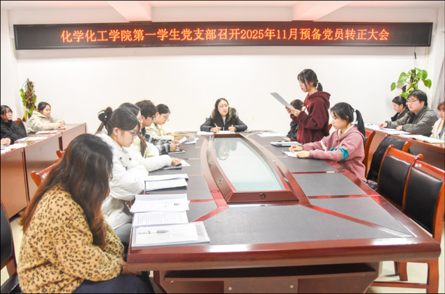为高效发挥党员先锋模范作用,持续强化队伍建设,切实提升党组织凝聚力与战斗力,化学化工学院第一学生党支部于2025年11月15日19时,在至安楼(北)607会议室召开2025年11月预备党员转正大会,讨论表决唐宇、方洁两名同志转为正式党员。本次会议由化学化工学院第一学生党支部书记黎兰同志主持,第一学生党支部全体党员同志参加。