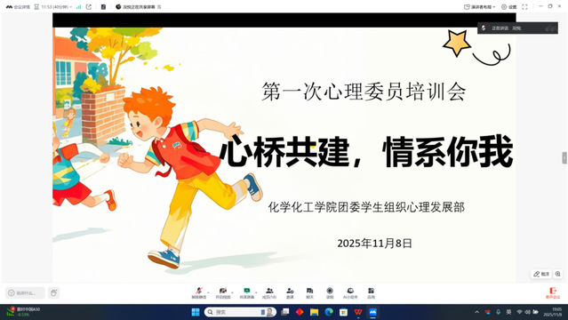 为进一步筑牢校园心理健康防线,提升班级心理委员的履职能力,11月8日,化学化工学院于腾讯会议开展了以“心桥共建,情系你我”为主题的心理委员培训会。化学化工学院2025级各班心理委员及团委学生组织心理发展部部分成员参与此次培训会。