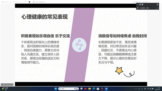 培训会伊始,主讲人阐述了心理委员“情绪变化观察员”和“危机事件预警员”的角色定位,并结合心理健康的具体表现,详细讲解了心理问题的识别与应对方法。随后,她指导心理委员如何在日常学习生活中敏锐捕捉同学的情绪变化,并鼓励他们运用倾听、共情等方式给予有效支持。紧接着,主讲人带领心理委员们熟悉危机情况的上报流程,确保大家在面对突发心理危机时能够规范、高效地开展工作。