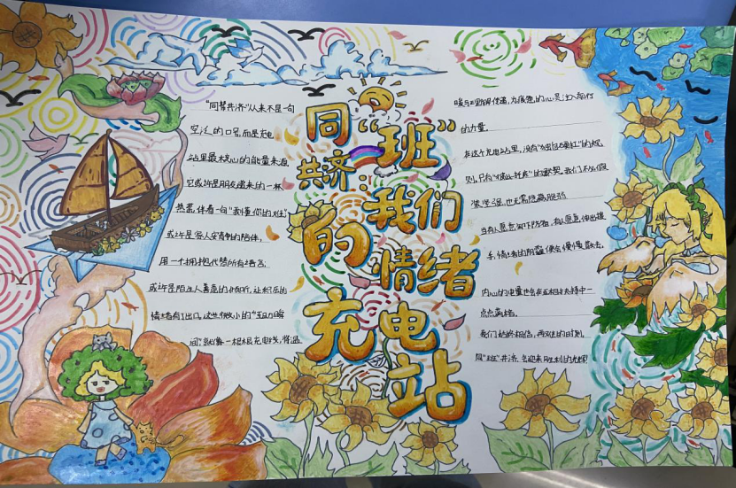 此次活动要求学生以2至6人集体为单位,并围绕宿舍、班级、学院、社团等七类心理之家主题展开创作。参赛队伍需提交A3尺寸纸质手抄报,并在作品中融入心理健康知识、成长故事、特色活动等内容,生动呈现不同集体中的心理支持与温暖氛围。活动过程中,同学们运用丰富的色彩与细腻的笔触,勾勒出温馨的宿舍生活、团结的班级风貌、互助的院系互动等不同维度的心理之家图景,将对集体的归属感与心理健康理念融入创作,让温暖在画卷中流淌,帮助异乡求学的学子感受校园温情。本次活动最终评选出一等奖2名、二等奖4名、三等奖6名、优秀奖8名。其中,作品《同“班”共济,我们的情绪充电站》荣获一等奖,并被推选为班级系列代表。