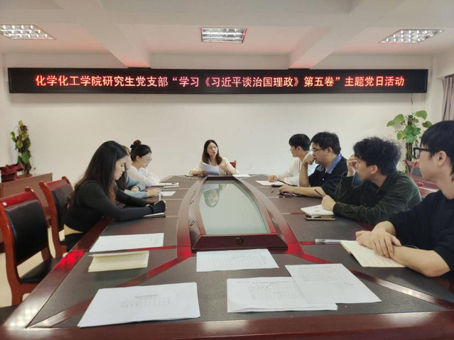 为引导全体研究生党员深刻领会习近平新时代中国特色社会主义思想的核心要义,筑牢思想根基、提升理论素养,切实将理论学习成果转化为推动科研与服务社会的实践动力,2025 年 10 月 17 日下午 14:00,化学化工学院研究生党支部于至安楼(北)607 会议室开展 “学习《习近平谈治国理政》第五卷” 主题党日活动。此次活动由研究生党支部书记刘方乘主持,全体学生党员参会。