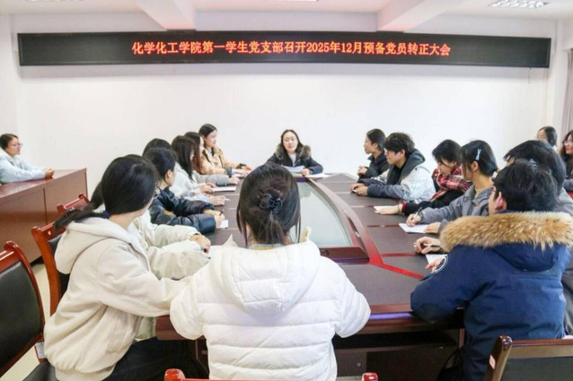 为充分发挥党员的先锋模范带头作用,持续加强党支部队伍建设,进一步增强党组织的凝聚力与战斗力,化学化工学院第一学生党支部于2025年12月2日12点30分,在至安楼(北)607会议室召开2025年12月预备党员转正大会,讨论表决杨优、张娜、马丽娜三名同志转为正式党员。本次会议由化学化工学院第一学生党支部书记黎兰同志主持,支部全体党员同志参加。