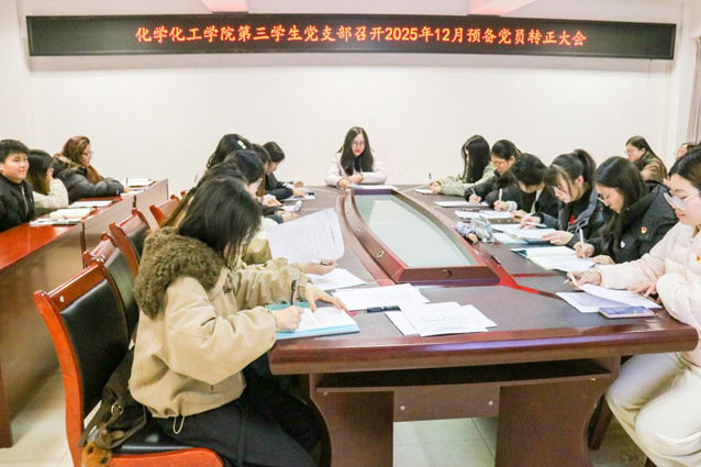 为扎实做好党员发展工作,切实增强基层党组织的凝聚力与战斗力,2025年12月2日19时,化学化工学院第三学生党支部于至安楼(北)607会议室召开12月预备党员转正大会,讨论表决王诗灿、王依卓、李兴颖三名同志转为中共正式党员。本次会议由化学化工学院第三学生党支部书记邓中燕同志主持,第三学生党支部全体党员参会。