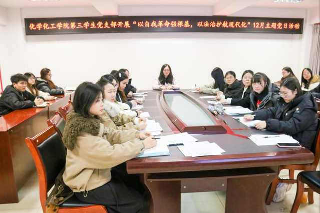 为深入学习贯彻习近平新时代中国特色社会主义思想,淬炼党员党性修养,夯实法治信仰根基,2025年12月25日20时,化学化工学院第三学生党支部于至安楼(北)607会议室开展以“以自我革命强根基,以法治护航现代化”为主题的党日活动,会议由化学化工学院第三学生党支部书记邓中燕主持,全体学生党员参与。